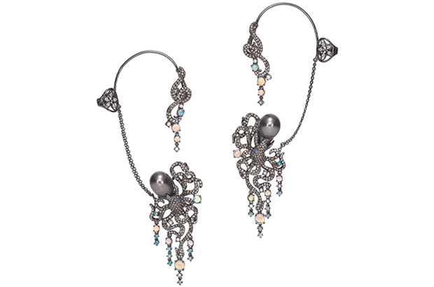 These 18-karat white gold ear cuffs feature opals, fancy color diamonds, white diamonds, black pearls and blue sapphires. They wrap up and around ($19,800), attaching to the ear at the cuff, where the chain stops. The octopus-inspired design hangs below, near the face. WendyYue.com