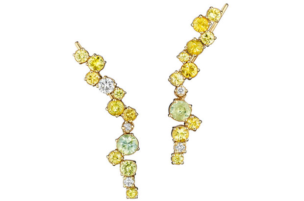 These earrings by Colette incorporate two trends: mismatched pairs and climbers. The set consists of a stud (left) and a climber, both 18-karat gold with black and white diamonds, that are designed to be worn together. The retail price is $2,475. ColetteJewelry.com
