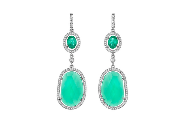 These 18-karat white gold earrings feature emerald and green chalcedony accented with pavé diamonds ($10,495).