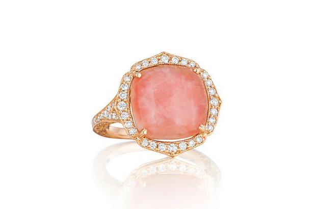 A cushion-cut pink opal ring accented with diamonds and made in 18-karat rose gold ($3,375).