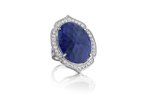 Preville’s oval-shaped sapphire split-shank ring with diamonds and 18-karat white gold ($11,675)