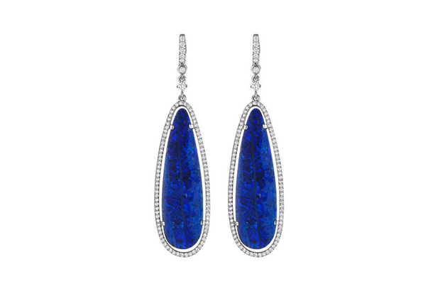 These long drop earrings feature dark blue boulder opal doublets and diamonds in 18-karat white gold ($9,770).