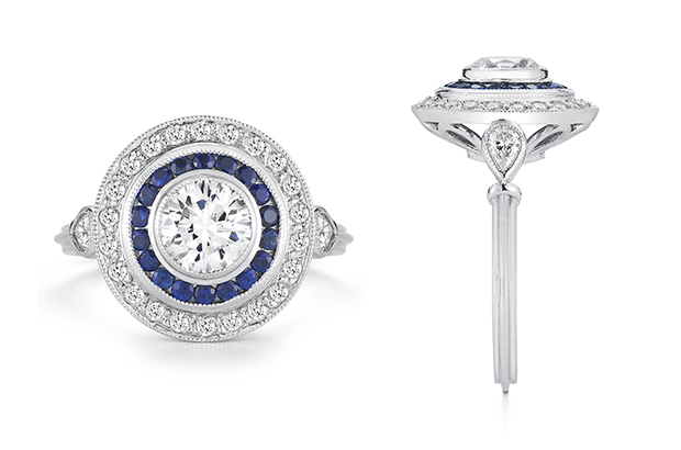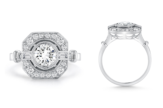 This handmade antique-inspired ring boasts a 1.01-carat bezel-set diamond and diamond melee arranged in an octagonal-shaped halo ($16,425 retail, not including center stone).