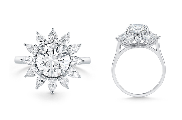 This handmade engagement ring features a 2.40-carat round brilliant-cut center stone surrounded by a halo of marquise-shaped diamonds weighing a total of 1.10 carats ($32,500 retail, including center stone).