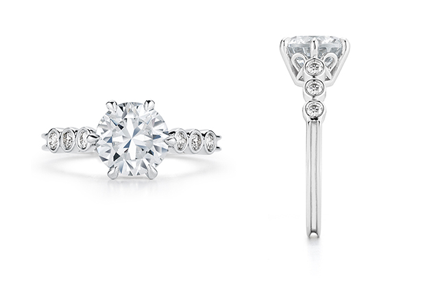 A handmade engagement ring with a round brilliant flanked by six cascading emerald-cut diamonds with slight milgrain accents ($5,550 retail, not including center stone)