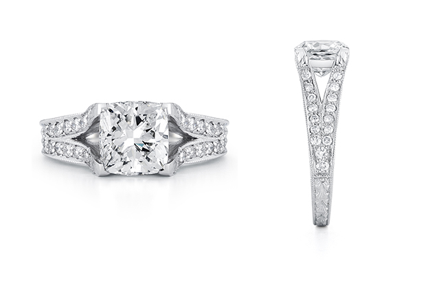Another handmade engagement ring features a 1.71-carat princess-cut diamond with a diamond- encrusted split shank and hand engraving on the sides and head of the ring ($20,000 retail, including center stone).