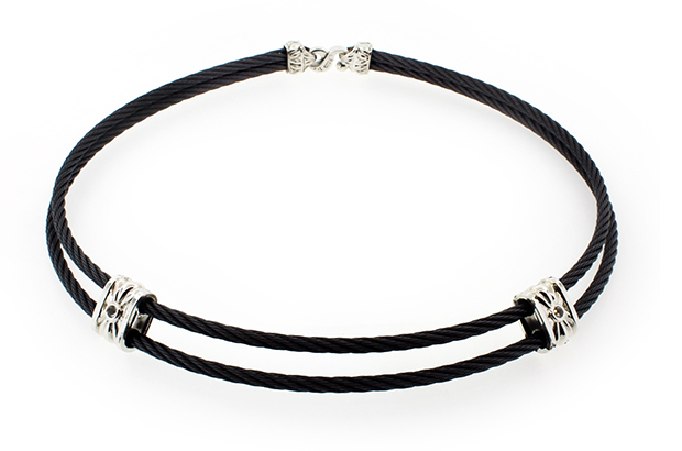 Women’s black titanium memory cable bracelet with sterling silver and sapphire accents ($515)