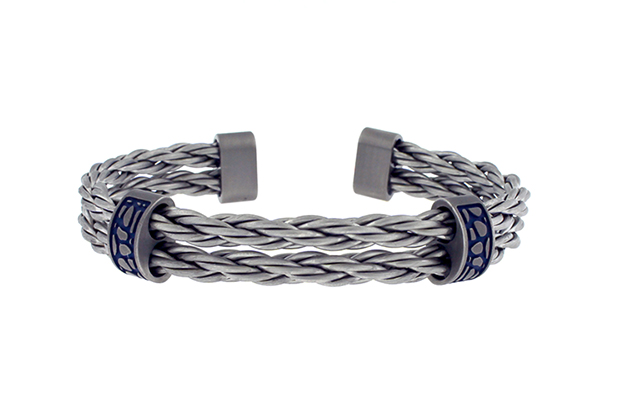 Gray titanium memory cable bracelet with accents made of cast gray titanium with recessed, anodized titanium accents ($685)