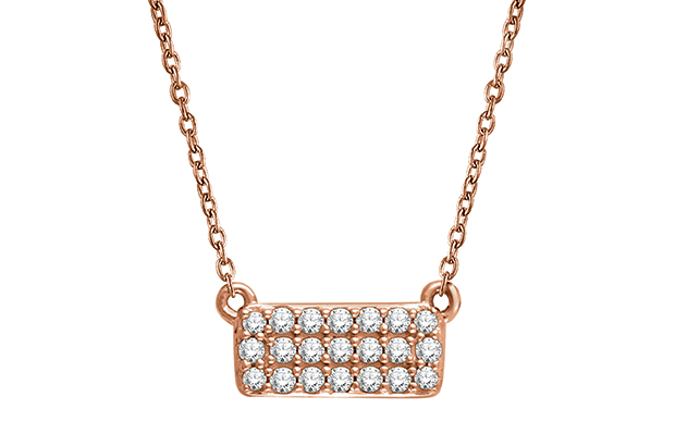 Stuller’s new 14-karat rose gold and diamond rectangle cluster necklace retails for $900. Booth #B6265 and #PC850