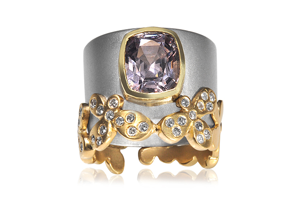 This “Bee and Flower” ring from Rebecca Myers Collection features spinel and diamonds in 18-karat yellow gold and palladium. It retails for $11,500. Booth #S10906