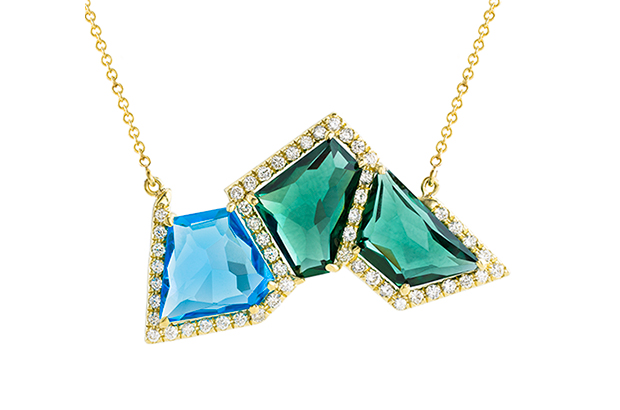 Marcia Budet’s 18-karat yellow gold blue topaz and green quartz necklace with diamond retails for $6,400. Booth #S11105