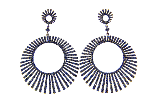 Dilamani’s large sunburst earrings feature 8.47 carats of sapphires set in silver with a black finish. They retail for $2,550. Booth #LUX237