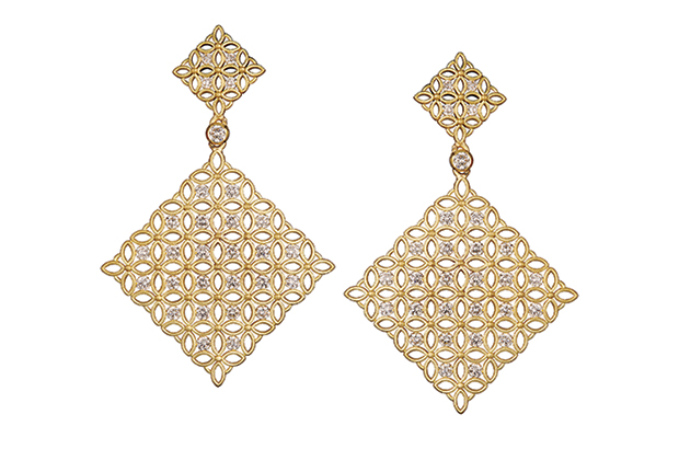 These 18-karat yellow gold earrings from Jack Kelege feature 1.52 carats of round diamonds. They retail for $6,900. Booth #LUX300