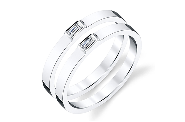 These 18-karat white gold bands from Rhonda Faber Green Designs’ “Aequalitatem” collection are sold together and feature a 0.07-carat baguette diamond on each. Each person in the couple wears one, but when the two are put together, it signifies love and equality, the designer said. They retail for $1,550 each. Booth #S10904