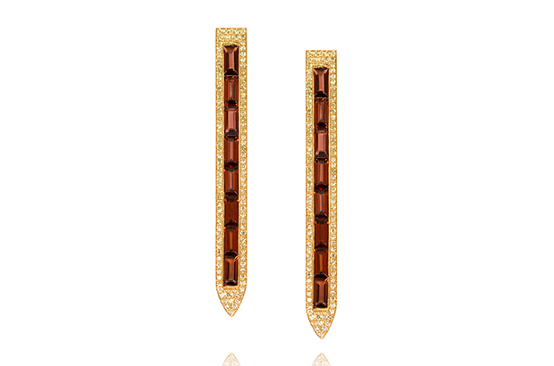These earrings from Ralph Masri are made with champagne diamonds, garnets and 18-karat yellow gold. They retail for $7,200. Booth #S11103