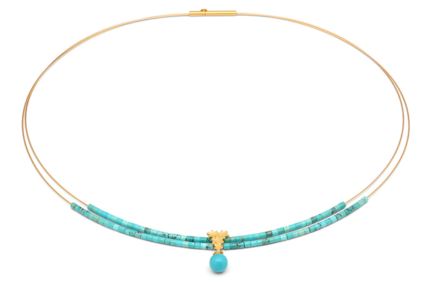 This necklace, from Bernd Wolf’s “Florentine” collection, features turquoise. It is 24-karat gold-plated sterling silver. It retails for $359. Booth #S10606