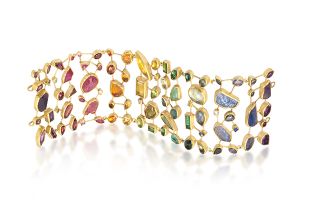Petra Class’s rainbow bracelet boasts an array of gemstones--amethyst, aquamarine, diamonds, sapphires, tourmaline, ruby, tanzanite, garnet, citrine, yellow beryl, and spessartite garnet--made in 18- and 22-karat gold. It retails for $28,000. Booth #S10801M