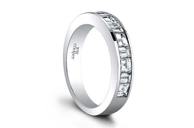 This wedding band is part of Jeff Cooper’s “Carly” engagement set, alternating 0.95 total carats of step-cut carre diamonds with 0.50 carats of straight, step-cut baguette diamonds. It comes in platinum, which retails for $7,200, and 18-karat gold, which retails for $6,600. Booth #LUX233