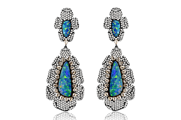 These drop earrings from Sutra boast 15 carats of opal and 19 carats of diamonds set in 18-karat black gold. They retail for $35,000. Booth #LUX316
