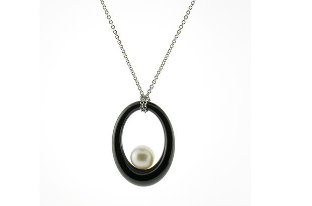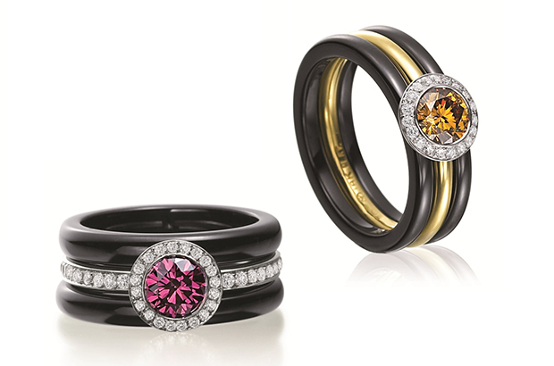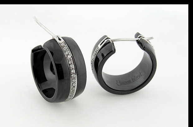 “Ceramique gem ceramic jewelry can be made in a number of colors by slightly changing the chemical composition of the ceramic,” Perret says. “Currently we are making designs in jet black, snow white, creamy ivory, baby pink, lapis blue, jade green, steely gray and chocolate brown.” Perret’s black ceramic hoop earrings with 18-karat white gold and diamonds ($5,775)