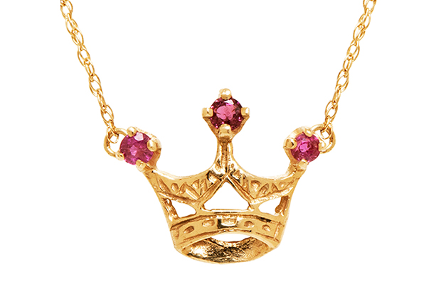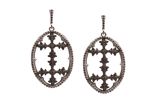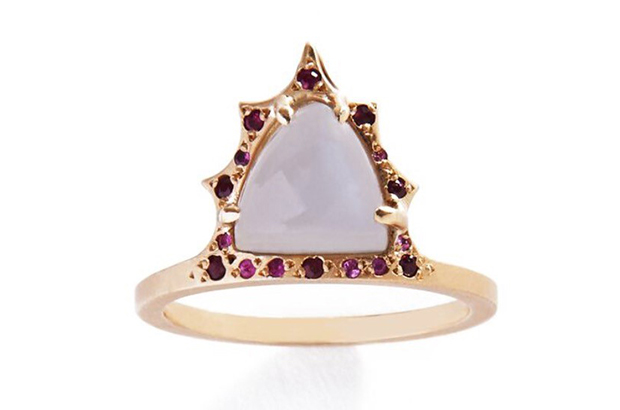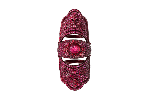 This Medieval-inspired one-of-a-kind ring from Karen Karch boasts a 5.87-carat rose-cut ruby held by three sharpened claws, each studded with a colorless brilliant diamond sitting just above a halo of diamonds at the base, set in blackened 18-karat white gold ($10,000).