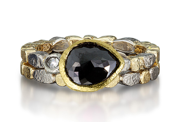 The “Skinny Pebbles” ring by Rona Fisher offers a 1.25-carat pear-shaped rose-cut black diamond set in 18-karat gold with palladium pebbles and one rose-cut white diamond, shown here with a Skinny Pebbles band ($3,695). ronafisher.com