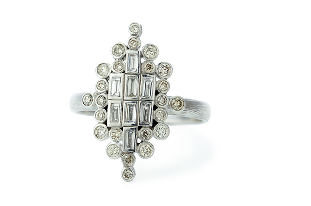 Laurie Kaiser’s “Sprinkles” ring has white baguette diamonds and brown brilliant diamonds set in 18-karat white gold ($4,150). lauriekaiser.com