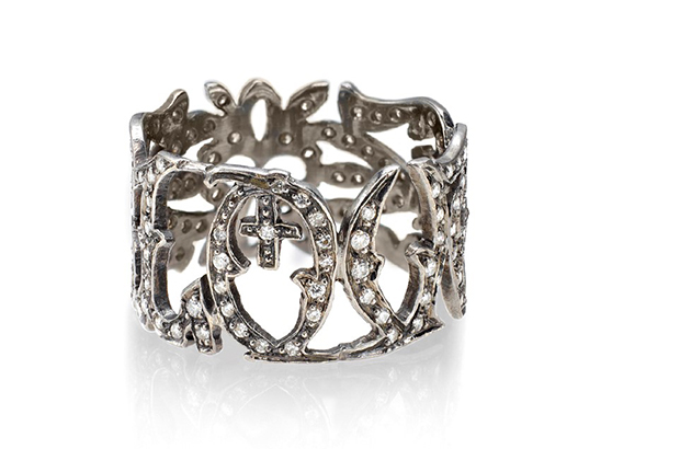 This intricate diamond “Love” band by Catherine Angiel is made in 14-karat white gold with white diamonds ($5,700). catherineangiel.com