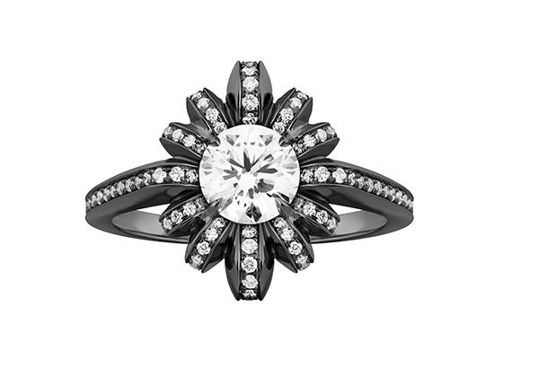 The “Tori” flower ring by Melissa Kaye, in 18-karat blackened gold with diamonds ($15,950) melissakayejewelry.com