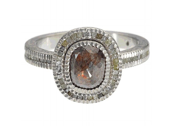 This palladium ring with a fancy diamond center surrounded by raw diamond cubes and white brilliant-cut diamonds is the trademark Todd Reed look ($5,280). toddreed.com