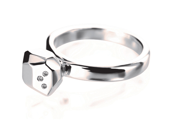 Delphine Leymarie’s “Facets” diamond solitaire ring, made in hand-carved, reclaimed 18-karat gold with white diamonds as an abstract play on the traditional solitaire. Available in white, rose and yellow gold ($1,695). delphineleymarie.com