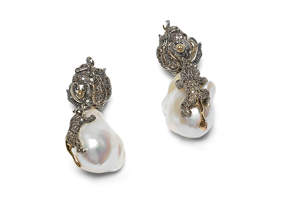 These baroque pearl earrings, also by Bibi van der Velden, stare back at you in sterling silver and 18-karat rose gold with brown diamonds ($9,538). bibivandervelden.com