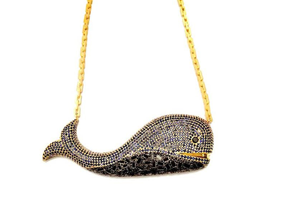 This little Rhino pendant by Bibi van der Velden is sterling silver and 18-karat yellow gold with brown, white and polky (a type of cut used in India with an irregular faceted top and flat bottom; similar to a rose cut) diamonds and blue sapphires ($3,336). bibivandervelden.com