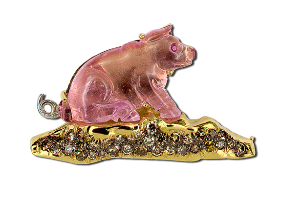 This cutie by Gumuchian was carved from pink rubellite and set with yellow and brown diamonds in 18-karat gold ($10,000). gumuchian.com