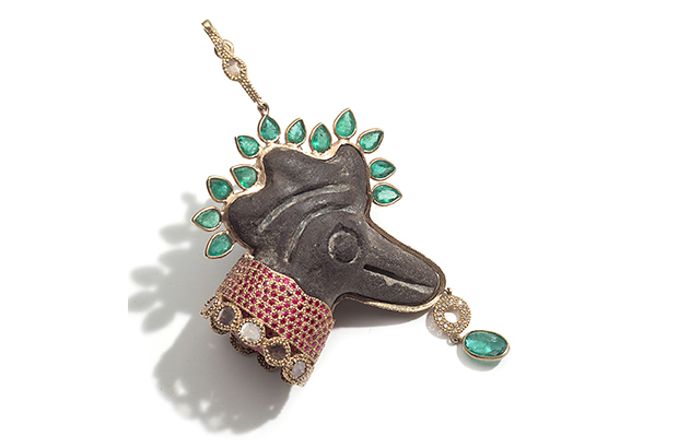 Our oldest beast this week is Coomi’s antiquity 20-karat gold Bird pendant from Ancient West Mexico, made circa 300 B.C. to 200 A.D. with rubies, sapphires and diamonds ($16,500). coomi.com