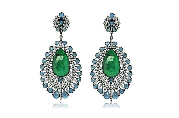 Sutra’s emerald, sapphire and diamonds dangle earrings, set in black gold ($19,000) sutrajewels.com