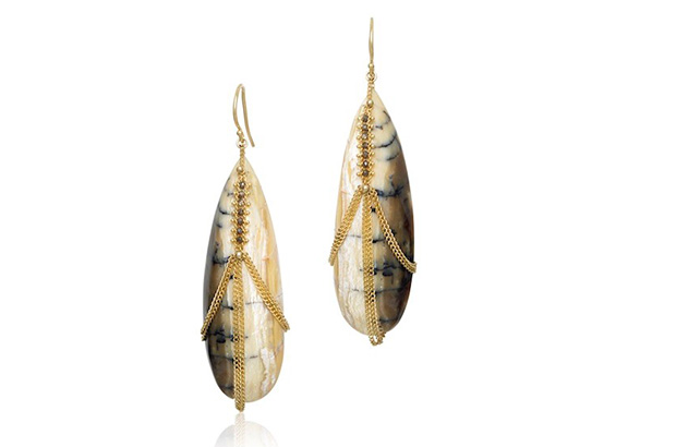 Pamela Huizenga’s 18-karat gold earrings with 39.35 carats of fossilized sequoia drops and diamond accents (price upon request) pamelahuizenga.com