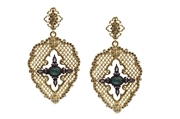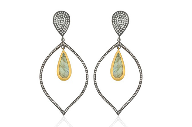 Lika Behar’s 24-karat gold and oxidized silver “Leaf Drop” earrings offer pear-shaped cabochon labradorite and gray diamonds ($3,740). likabehar.com