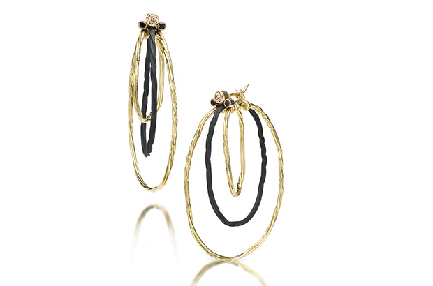 Sarah Graham’s “Clover” triple-hoop earrings, made in 18-karat yellow gold and oxidized cobalt chrome with cognac and black diamonds ($5,760) sarahgraham.com