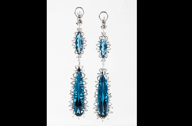 Suzanne Kalan’s one-of-a-kind 18-karat white gold and earrings offer white diamond baguettes and London blue topaz drops ($16,000). suzannekalan.com