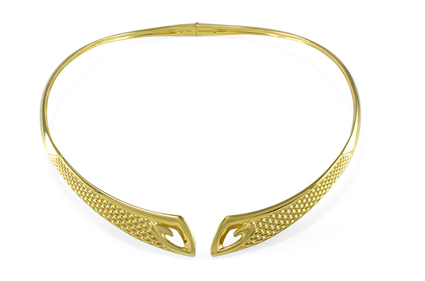 The "Diagonal" collar from Edgeworth Jewelry by Mackenzie Law is made of handwoven stainless steel with a continuous sterling silver stripe and sterling silver endcaps ($2,900). edgeworthjewelry.com