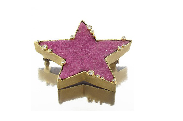 Barbara Heinrich’s pink cobalt calcite star lapel pin, wrapped in hammered 18-karat yellow gold with 16 scattered diamonds across the top rim ($9,375) barbaraheinrichstudio.com