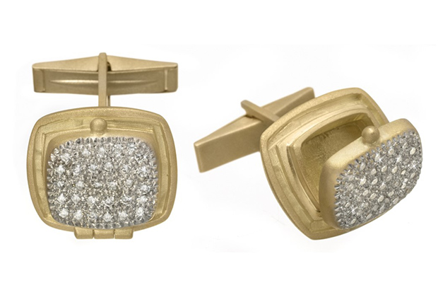 Steven Kretchmer’s cushion cufflinks in platinum and gold with diamond accents ($3,800) kretchmer.biz