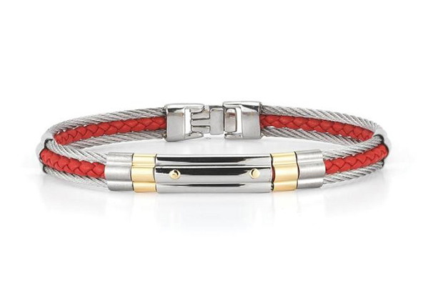 Also from Alor, 18-karat yellow gold, stainless steel and red leather cable bracelet ($325) alor.com