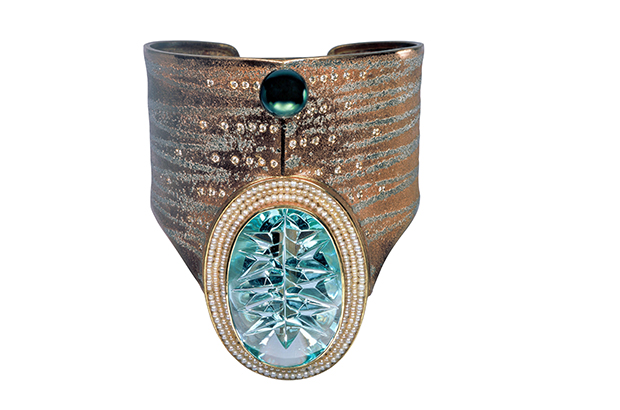This one-of-a-kind cuff by Peter Schmid/Atelier Zobel is 19-karat rose gold and platinum and set with a peacock Tahitian pearl and a one-of-a-kind aquamarine cut by master Tom Munsteiner (price upon request). atelierzobel.com