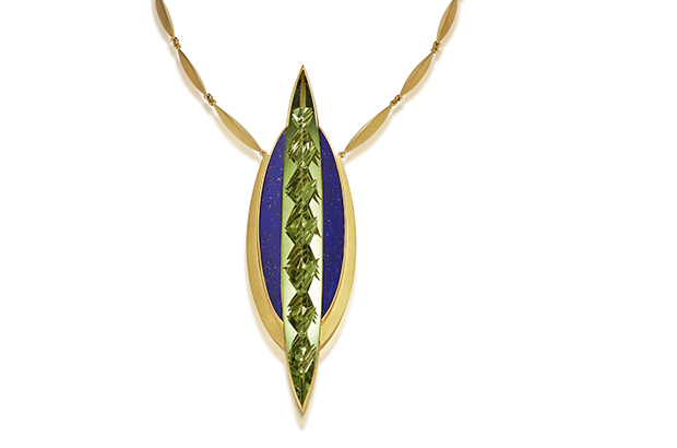 This custom-cut peridot and lapis by master cutter Tom Munsteiner finds itself the centerpiece in this 18-karat gold necklace by his award-winning jewelry designer (and wife) Jutta Munsteiner (price upon request). munsteiner-cut.de