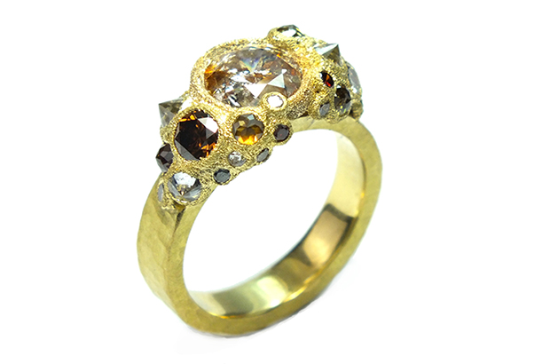 tapbytoddpownell.com' filename='Todd Pownell's 18-karat hammered gold shank is set with a cluster of mixed diamonds cascading down each side of a 2.06-carat round center diamond with orange and black inclusions ($11,580). tapbytoddpownell.com' width='1104' presentation='gallery'> 'Todd Pownell's 18-karat hammered gold shank is set with a cluster of mixed diamonds cascading down each side of a 2.06-carat round center diamond with orange and black inclusions ($11,580). tapbytoddpownell.com'