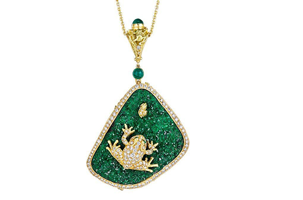God is in the details of this pendant by Anthony Lent, which shows off many intricate, hand-carved features in 18-karat yellow gold and uvaravite, diamonds and emeralds ($41,700). anthonylent.com