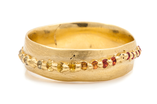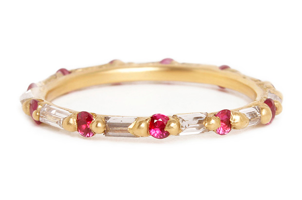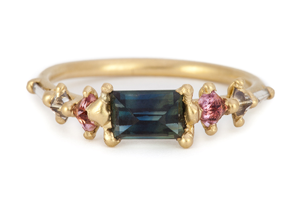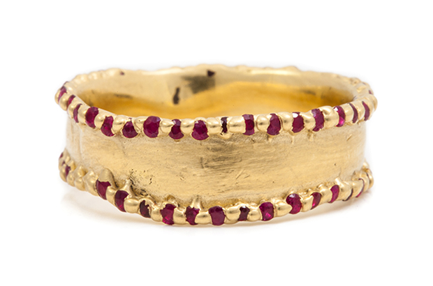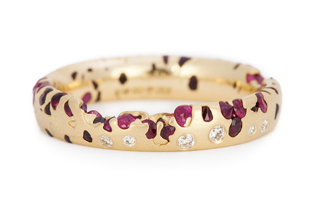 Designer Polly Wales likes to set her gemstones in precious metals in such a way that the resulting effect has a “from-the-earth” aesthetic, like the stones are breaking through the surface of the gold.