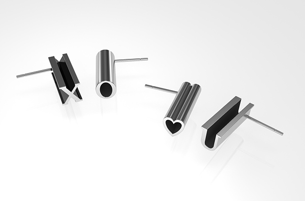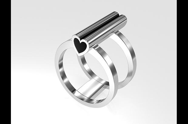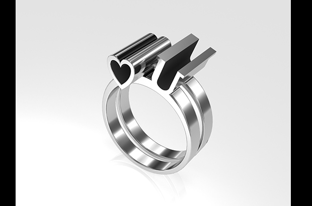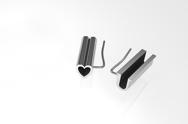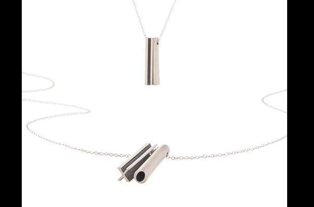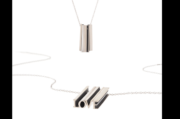 From one angle, they appear to be simple bars. But then the wearer flips the piece up, revealing a special letter, number or symbol chosen from a stock of characters created by Macri.